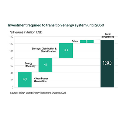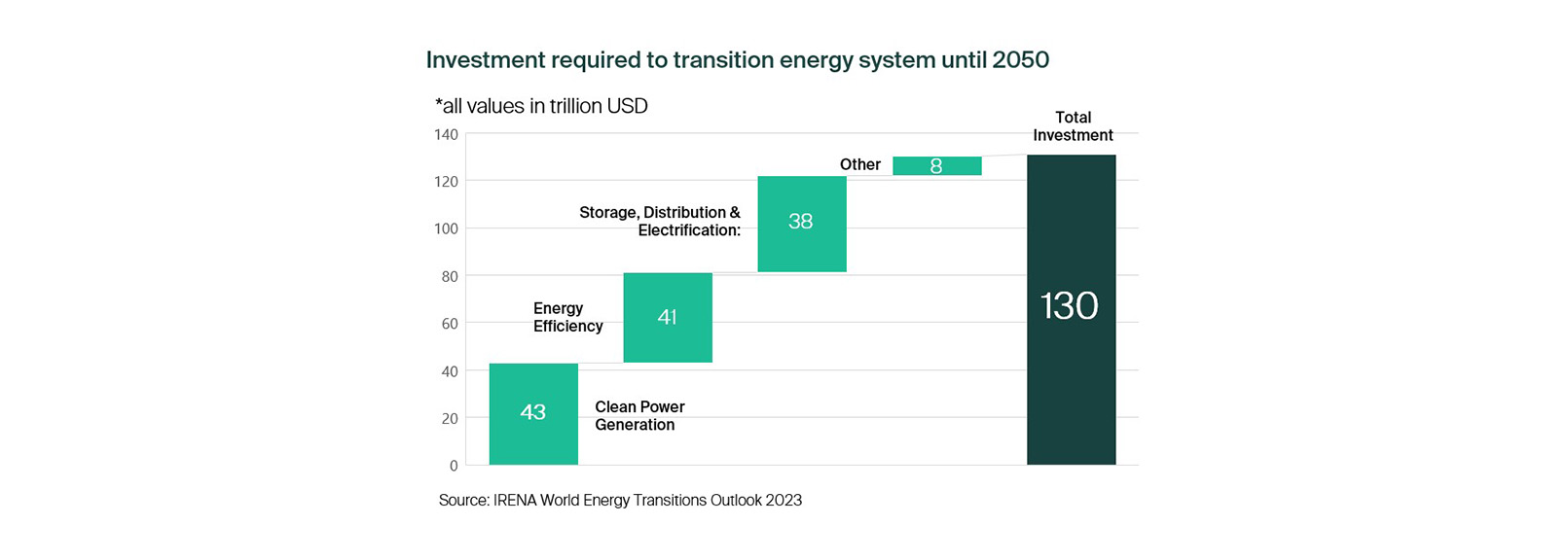 Reassuringly, capital flows increasingly match that widened understanding given the investment opportunities on offer. This trend has to continue, at scale, to accelerate the much-needed transition. According to the International Renewable Energy Agency’s “1.5°C Scenario”, renewable energy will require the largest investment over the next 27 years, followed closely by energy efficiency measures and investments in grid, energy storage, and end-use electrification. And the amounts are staggering – IRENA estimates that USD 130 trillion will have to be invested until 2050, or an average of USD 4.8 trillion per year [2].