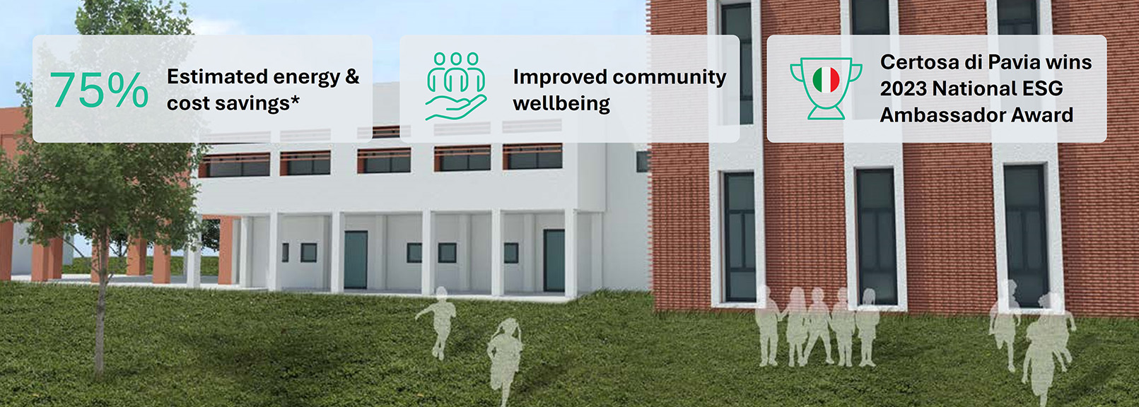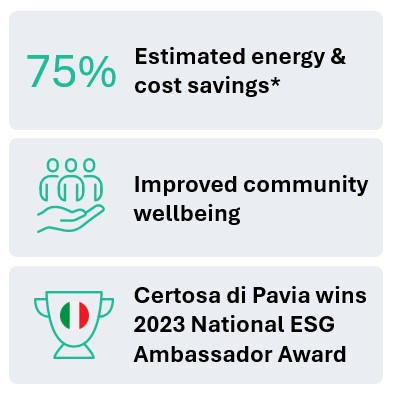 In 2023, the success of the project was further affirmed when the municipality of Certosa di Pavia won an award for its energy-saving efforts at the Italian National Ambassadors awards where municipalities and businesses that are most attentive to the wellbeing of their communities are honoured – a testament to the high quality of Samso’s work and to the broader positive social impact of our financing.